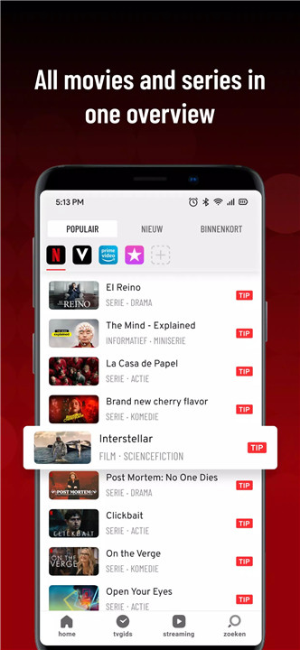 Discover all the new, popular, and upcoming movies and series from every major streaming service in the Netherlands. TVgids.nl supports Netflix, Prime Video, Disney+, HBO Max, Apple TV+, Viaplay, and many others — you can even start watching with just one tap inside the app.