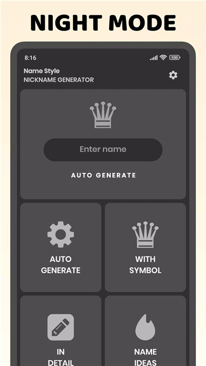 Enjoy a more comfortable experience with the built-in night mode feature, perfect for late-night nickname crafting.