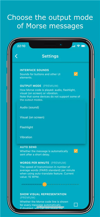 Personalize your Morse Chat experience with extensive customization options. Adjust transmission speed, choose Morse message output modes (audio, blinking light, flashlight, vibration), and select from various themes (Cyan, Bright, Dark, Black) to suit your preferences.
