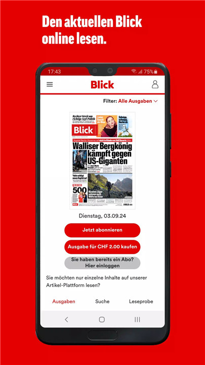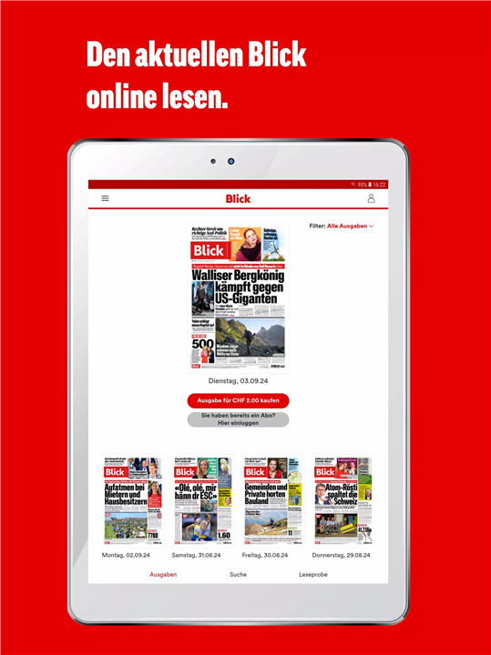 Blick E-Paper ensures you're never far from the pulse of Swiss life. Whether you're commuting, relaxing at home, or on the go, Blick's e-paper brings the strongest headlines and most spectacular images directly to your fingertips.