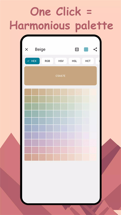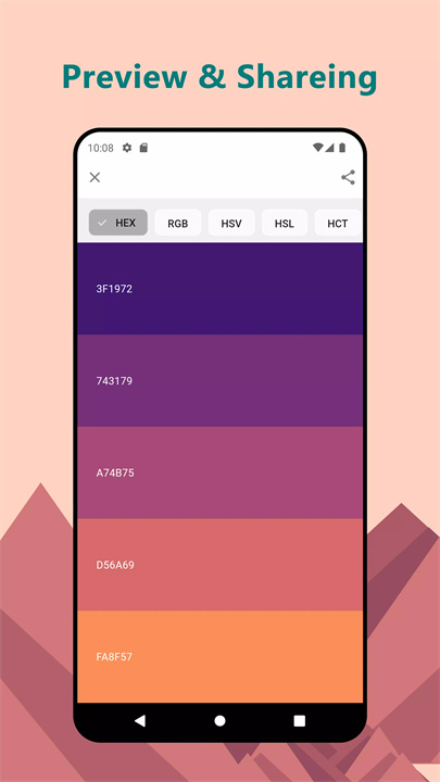 Colorific支持将色彩搭配方案导出为图片或直接复制颜色代码(包括Hex、RGB、HSV/HSB、HSL、LAB、HCT格式),并可以轻松分享到社交平台或与他人协作。