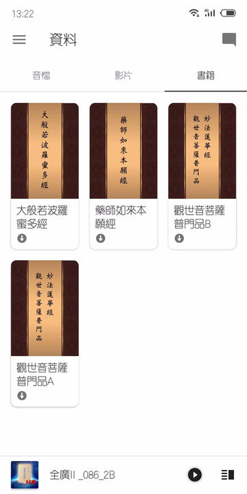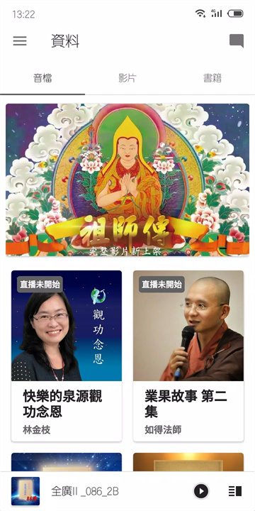 师父音档、老师开示、拜佛音档、赞颂练习、四家合注,、五大论摄类学、幸福十堂课等等。