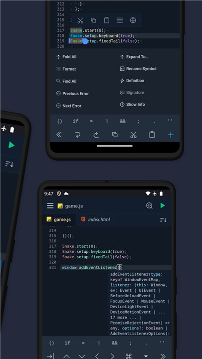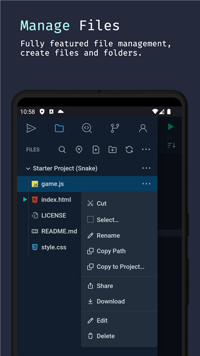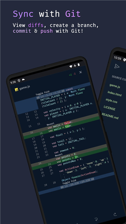 Spck Editor Lite empowers you to code directly on your Android device. Experience rapid modifications with TypeScript autocompletion, handy code snippets, and an additional on-screen keyboard. You can preview and debug HTML files seamlessly. Sync your updates with any git repository, whether it’s from GitHub, GitLab, Bitbucket, AWS CodeCommit, Azure DevOps, and more. You can clone repositories, make commits, and push changes right from your phone.