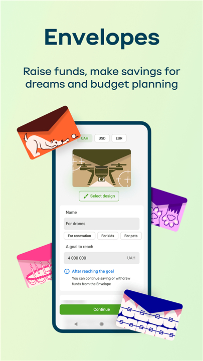 • "Envelopes" Service: Set and track financial goals for savings, donations, and budget management.