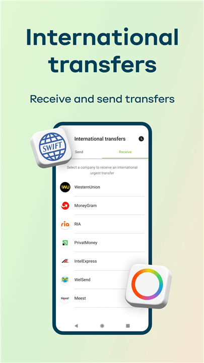 • Transfers: To IBAN account or Visa/Mastercard card numbers.