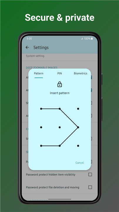 • Lock photos, videos, or the entire app with a PIN, pattern, or fingerprint
