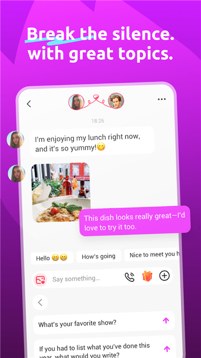 • To assist in breaking the ice, the application highlights current events and popular discussions.