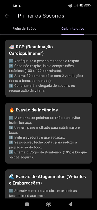 • First Aid Guide: Provides an interactive, step-by-step guide for managing injuries and urgent health situations.