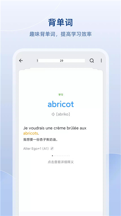 法语助手背单词不仅能满足您的基本需求,如词汇查找、翻译、笔记记录及单词记忆等,更为您带来了创新性的学习体验,例如主题写作、语法错误纠正等人工智能功能。这些功能将全方位地提升您的法语水平。