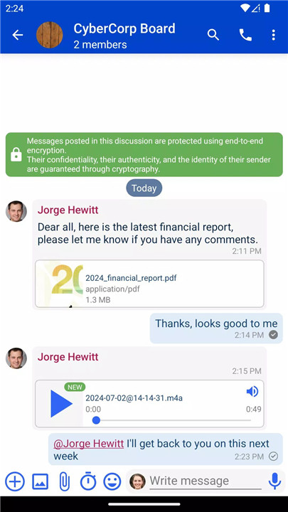 Every single message you send or receive on Olvid benefits from end-to-end encryption by default. This ensures that only you and the recipient can read the messages, not even Olvid can access your data. In addition, Olvid uses end-to-end authentication to make sure that both parties are truly who they claim to be.