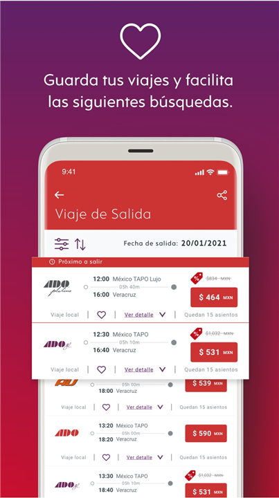 • Thanks to its modern design, user-friendly interface, and innovative features, ADO Móvil is prepared to accompany you before, during, and even after your journey.