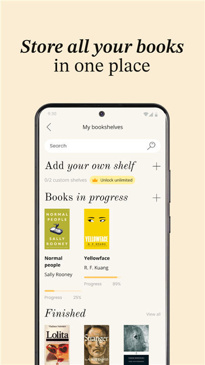• Streamline your evolving collection by organizing titles into intuitive, structured categories including Books in Progress, Finished, and Want to Read.