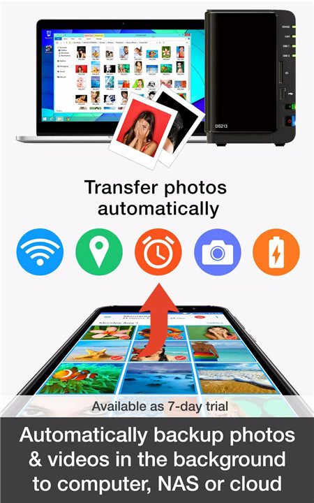 PhotoSync supports transferring media to and from NAS devices and cloud services, including Dropbox, Google Drive, Google Photos, OneDrive, Flickr, and more. This feature makes it simple to upload photos and videos to your preferred cloud storage or access and download media stored in the cloud or on NAS servers. PhotoSync is compatible with major NAS storage solutions such as Synology, QNAP, WD MyCloud, and FreeNAS, ensuring that you can manage your media on the go.
