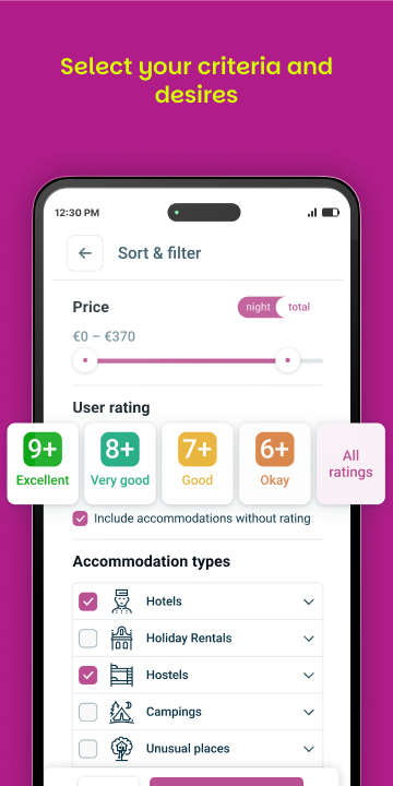 • Choose among hotels, apartments, houses, and distinctive stays.