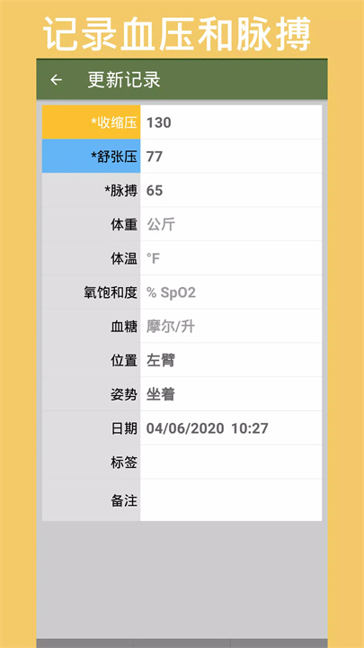 打开应用后,选择日期并输入您的收缩压、舒张压、脉搏等健康数据,应用会自动保存。