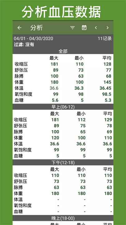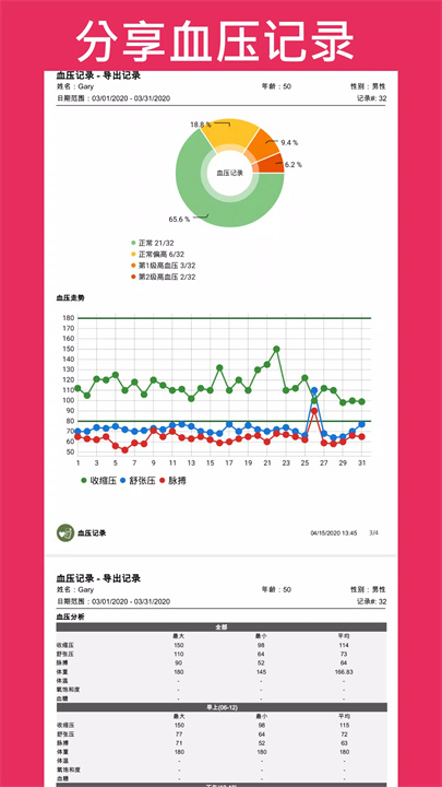 对于需要跟踪血压趋势的用户,应用提供了强大的数据分析功能。用户可以查看血压的最大、最小和平均值,并通过折线图直观地监控血压波动,帮助您实时了解健康变化趋势。这种趋势图表功能不仅方便日常检查,也为医生提供了可靠的数据支持,以便制定更合适的治疗方案。
