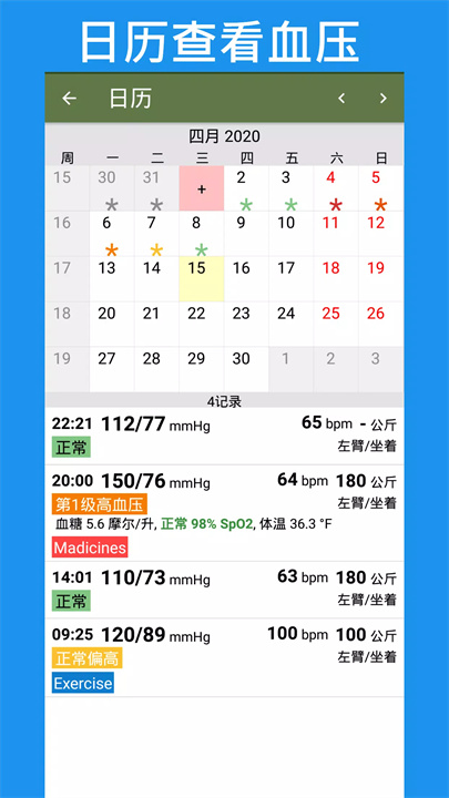 这款应用的核心功能包括记录收缩压、舒张压、脉搏、血糖、SpO2(血氧)和体重等健康数据,帮助用户全面掌握自己的身体状况。通过简单的操作,您可以将每日的血压数据记录下来,应用会自动根据输入的数值分类血压类型,例如正常、轻度高血压、高血压等。用户可以方便地查看和管理每一条记录,应用采用日历视图进行展示,使得历史数据一目了然。