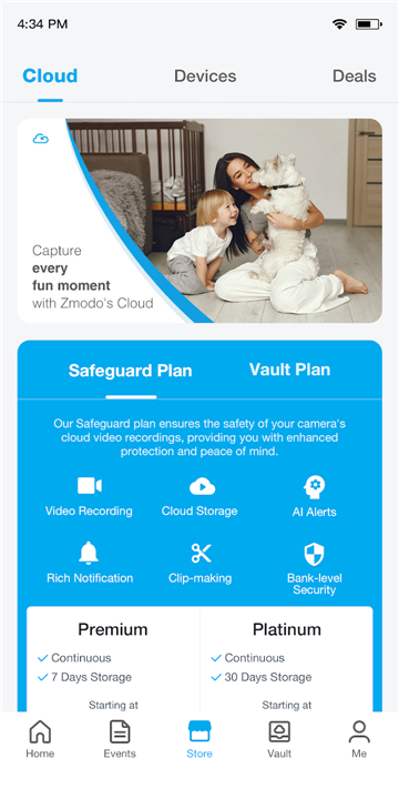 A: Zmodo offers two subscription tiers: Premium Cloud and Platinum Cloud. Premium Cloud costs $4.99 per device per month or $49.99 per year and includes basic cloud storage and event recording. Platinum Cloud, at $9.99 per device per month or $99.99 per year, provides extended storage time, longer video clip downloads, and priority support. Both plans automatically record motion-triggered events to the cloud for secure offsite storage.