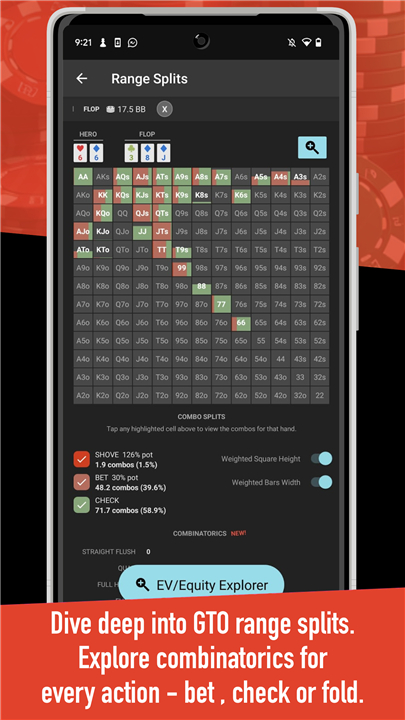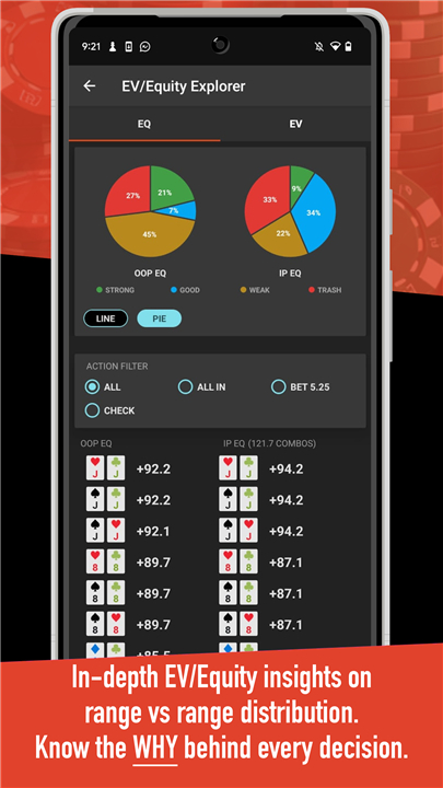Now there is an EV and EQ range chart with the option to view it from the perspective of the IP or OOP player. Tap any cell in the range chart to view the specific combos and respective EV or EQ values.