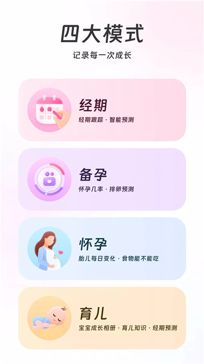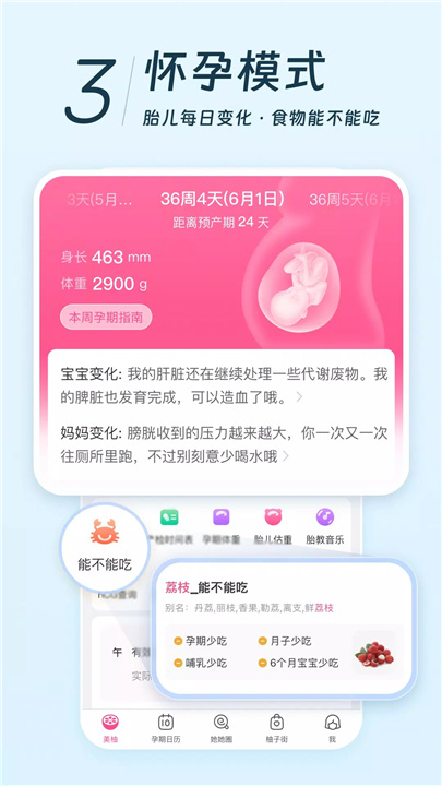 在科学备孕模式中,您只需轻轻一点,就能轻松查询到排卵日;在健康怀孕模式中,每日都会为您推送相关知识,让您对各种食物是否适合食用一目了然;在育儿护航模式中,它会为您记录宝宝成长的每一个珍贵瞬间。