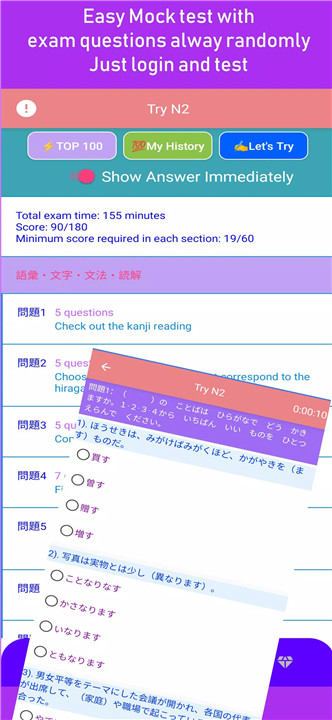 You can benefit from a collection of over 40,000 JLPT questions, including 200 questions from past exam papers. Practice with real exam questions to familiarize yourself with the test format and increase your confidence.