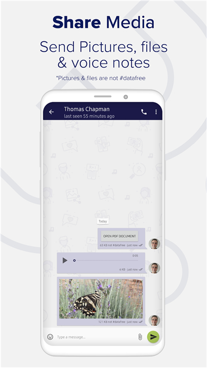• Share photos, videos, documents, and locations (not datafree—warning shown before sending)